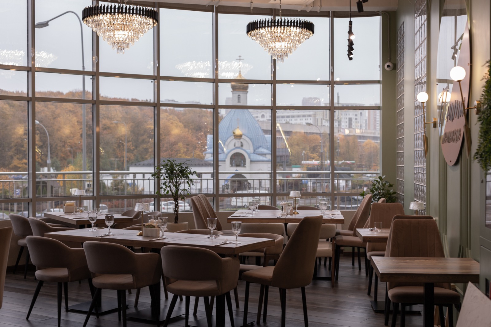 Просторный зал с панорамными окнами, гибкая рассадка, столы объединяются