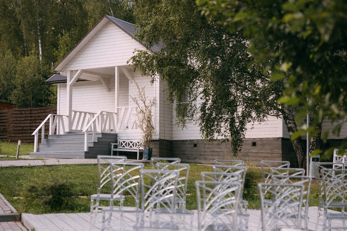 В аренду входит гостевой дом в американском стиле — светлый, белоснежный, с высокими потолками. Каждое пространство — идеальный фон для фотографий, а комната невесты с балконом и видом на озеро, наполнена светом и элегантностью.