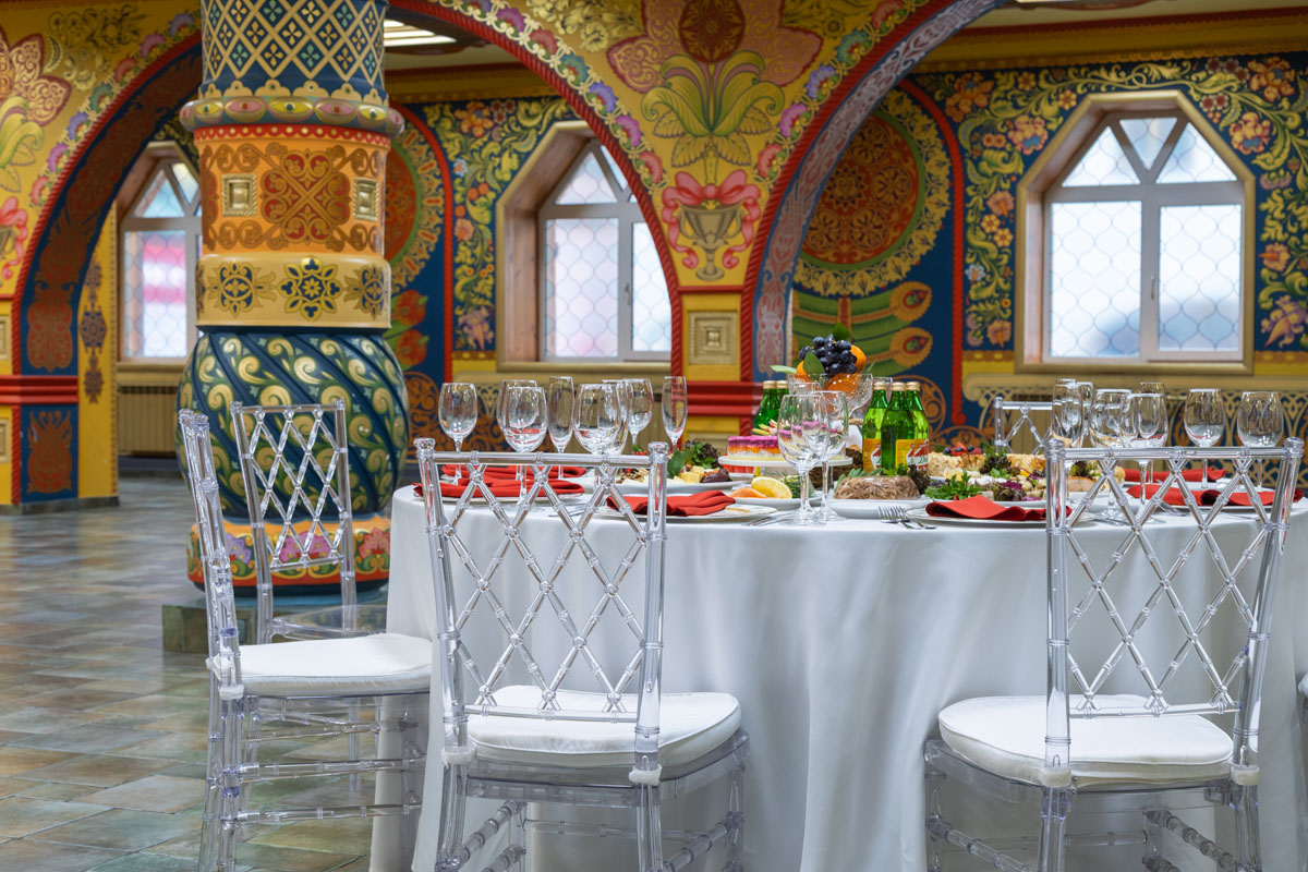 Декоративное оформление банкетного зала позволяет идеально вписаться в концепцию мероприятий «А-ля рус», «Русские сказки», «Этнические проекты» и многие другие мероприятия.