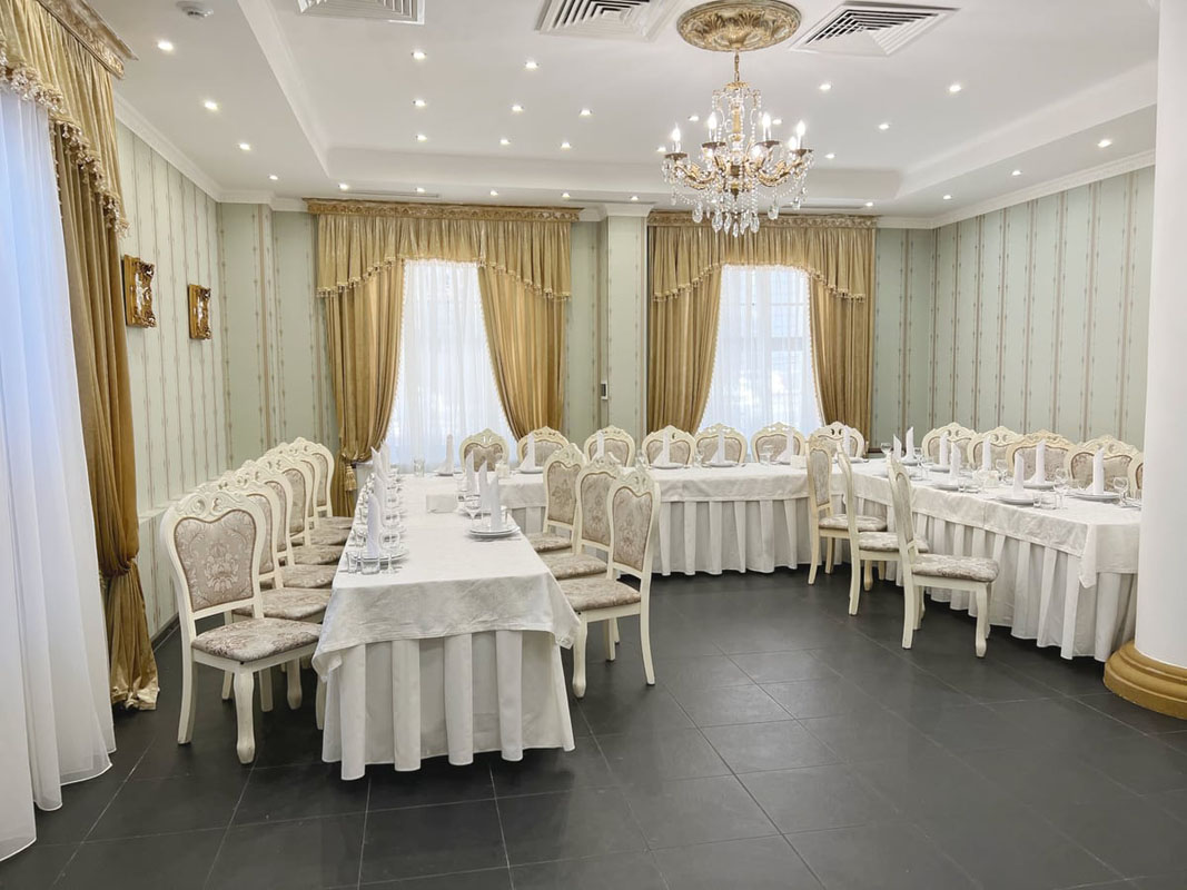 Русский зал состоит из двух зон разделенных колоннами. В обеденной зоне есть все необходимое для комфортного единовременно пребывания до 120 гостей на банкете.