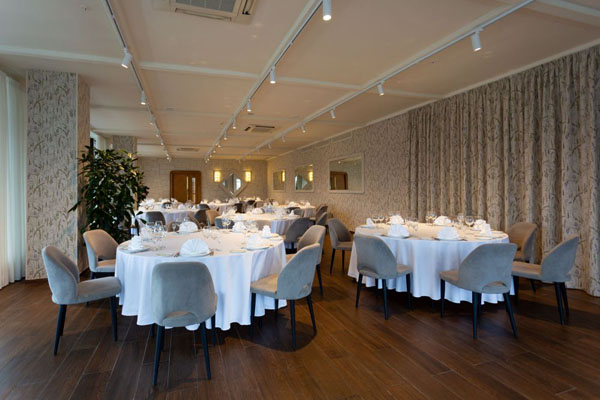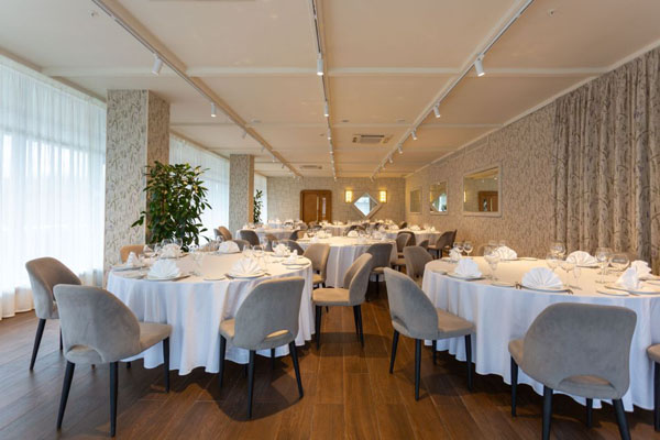 Интерьер зала выполнен в современном стиле с использованием качественных материалов и элегантных дизайнерских решений. Панорамные окна создают особую атмосферу и позволяют гостям наслаждаться великолепными видами в течение всего мероприятия.