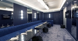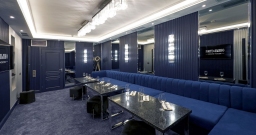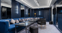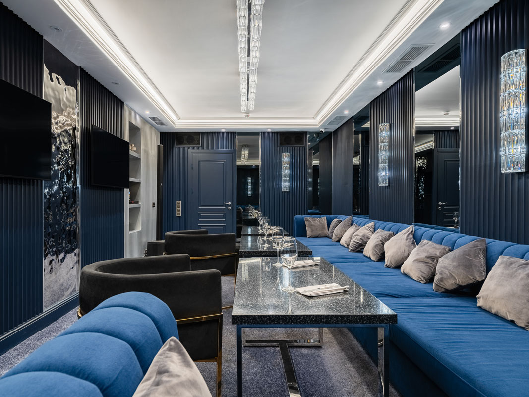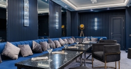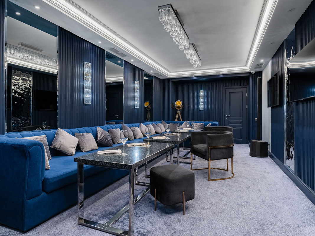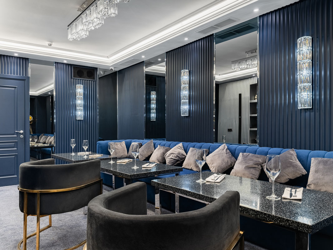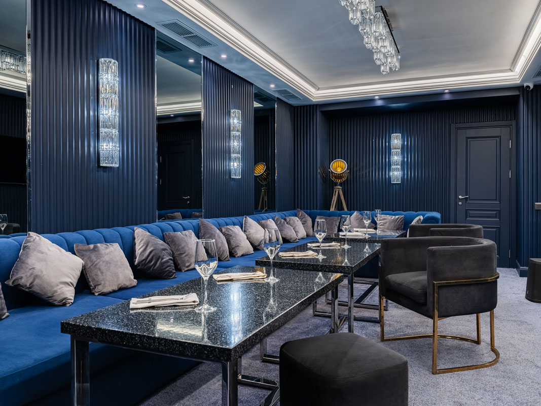 Тёмно-синие цвета мебели и золотые элементы декора создают атмосферу роскоши. Зеркала, освещение и фактурные узоры подчеркивают общую геометрию зала.