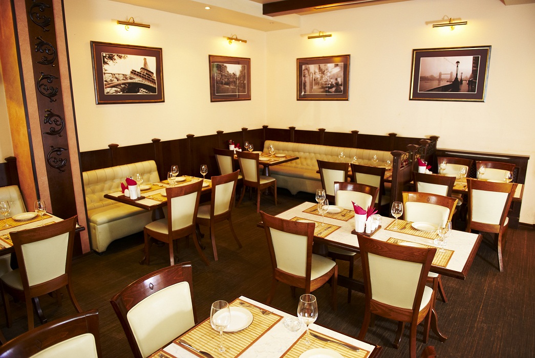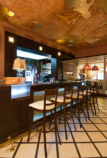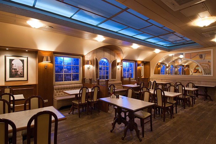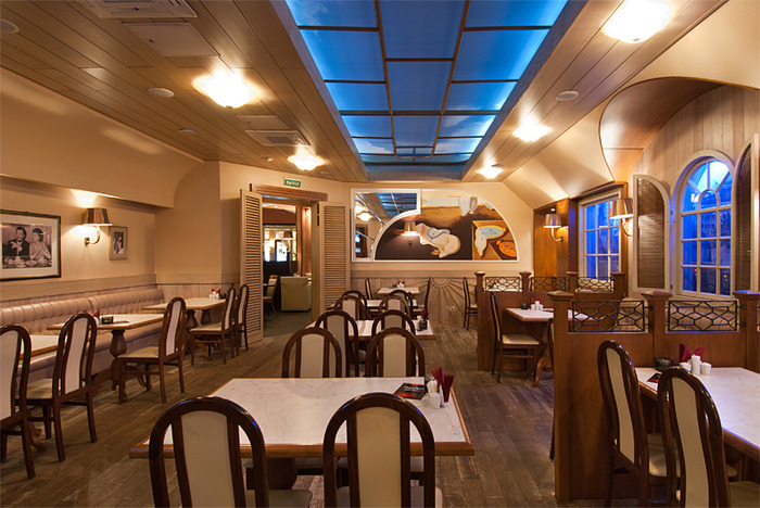 Интерьеры всех залов ресторана выполнены в европейском стиле, полны хорошего вкуса и респектабельности. Оригинальными элементами декора банкетного зала являются ложные окна с видами французской Каталонии и фрески в стиле Дали.