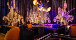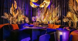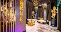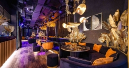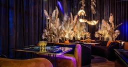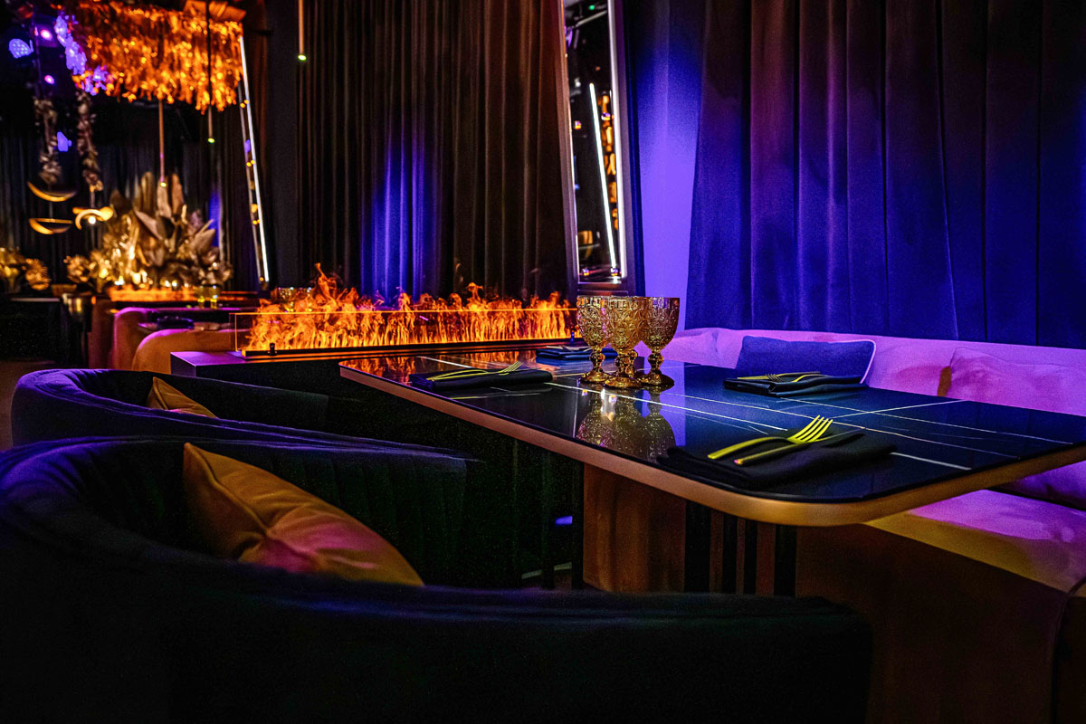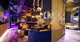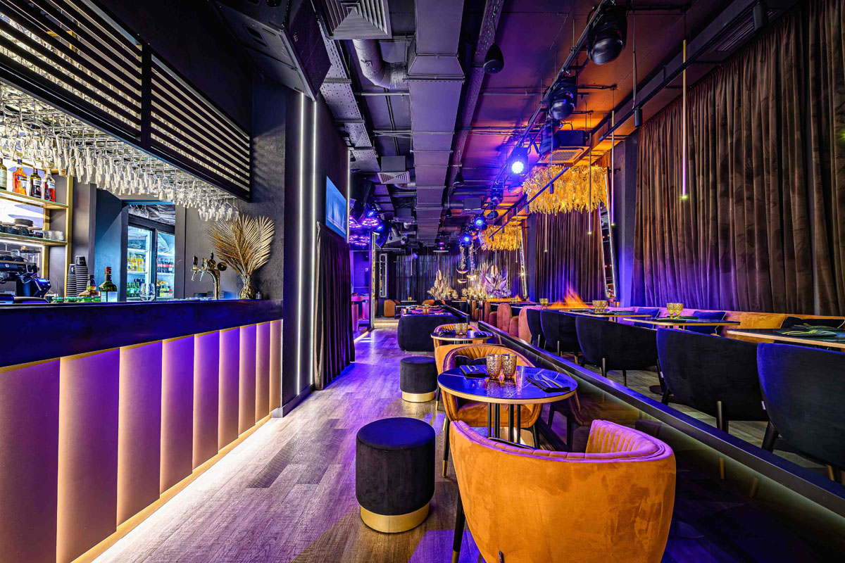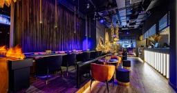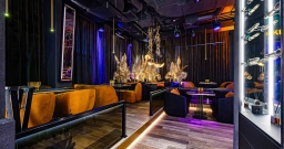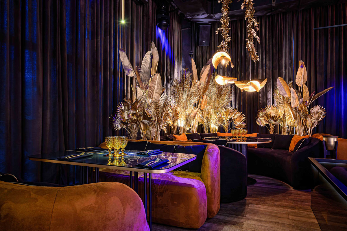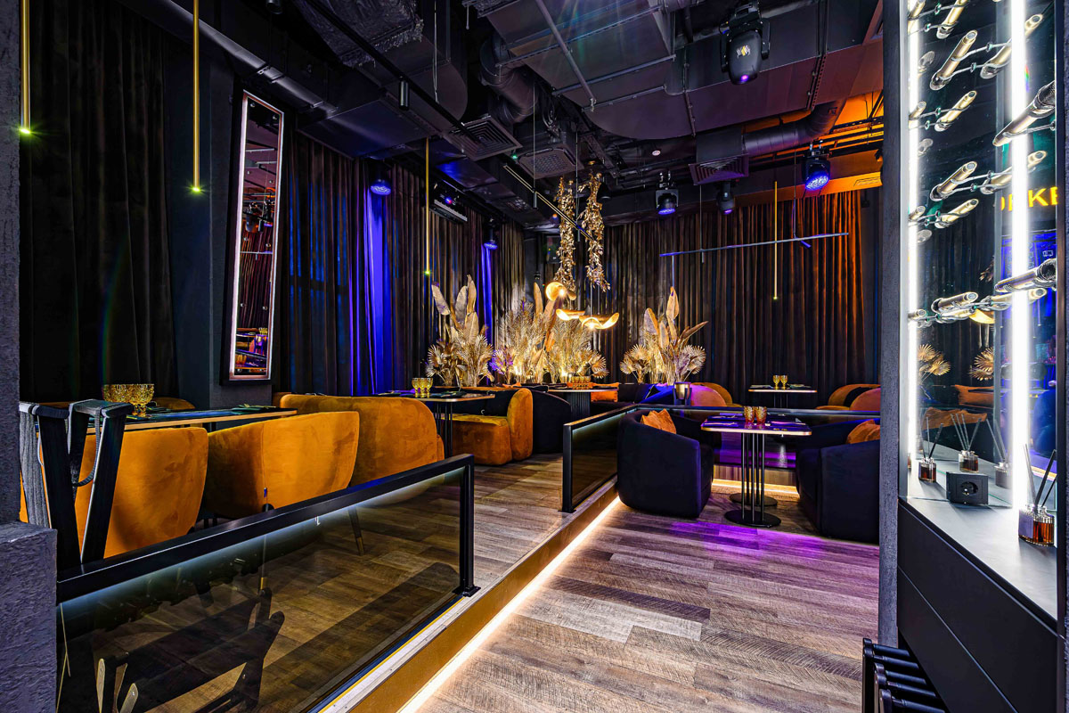 Уютный зал с мягкой мебелью и расслабляющей музыкой. Дизайн сочетает тёмную палитру оттенков, модную подсветку и сверкающее золото, а также натуральные материалы и экзотические акценты вроде необычных люстр и флористических композиций в вазонах. Точечная система освещения позволяет каждому столику создавать свою неповторимую атмосферу.