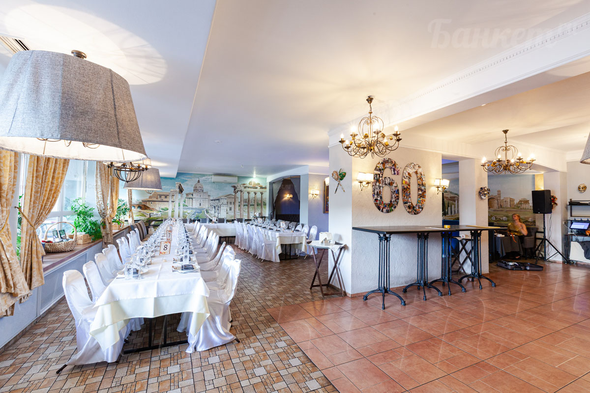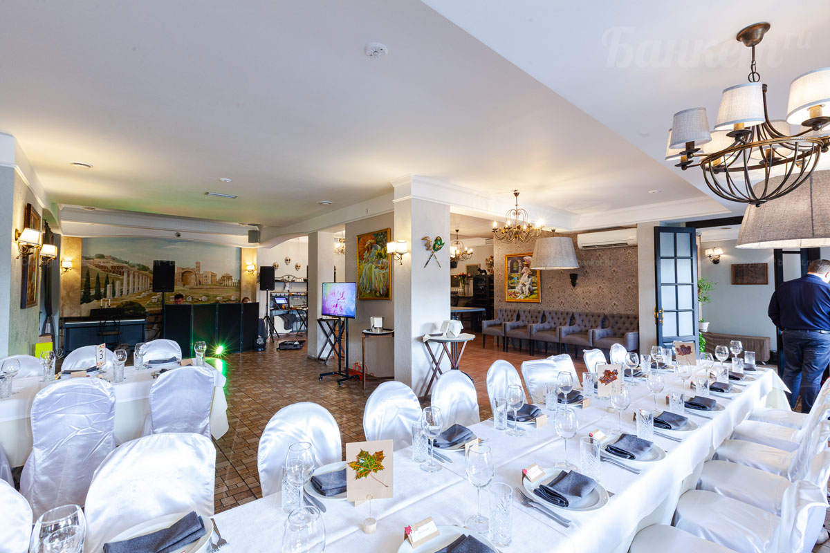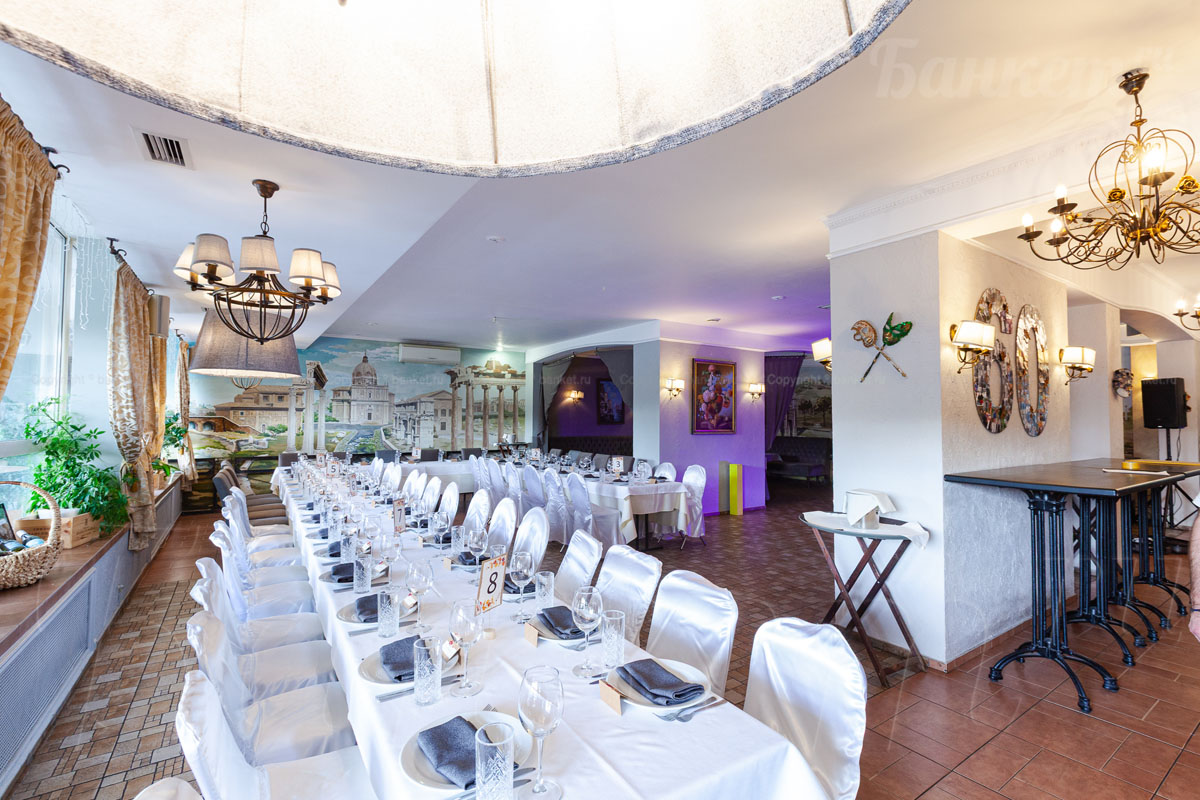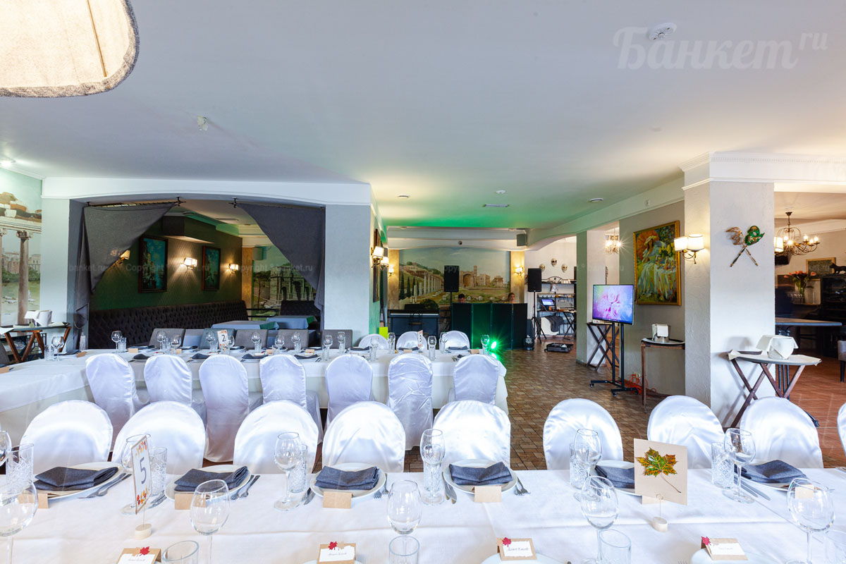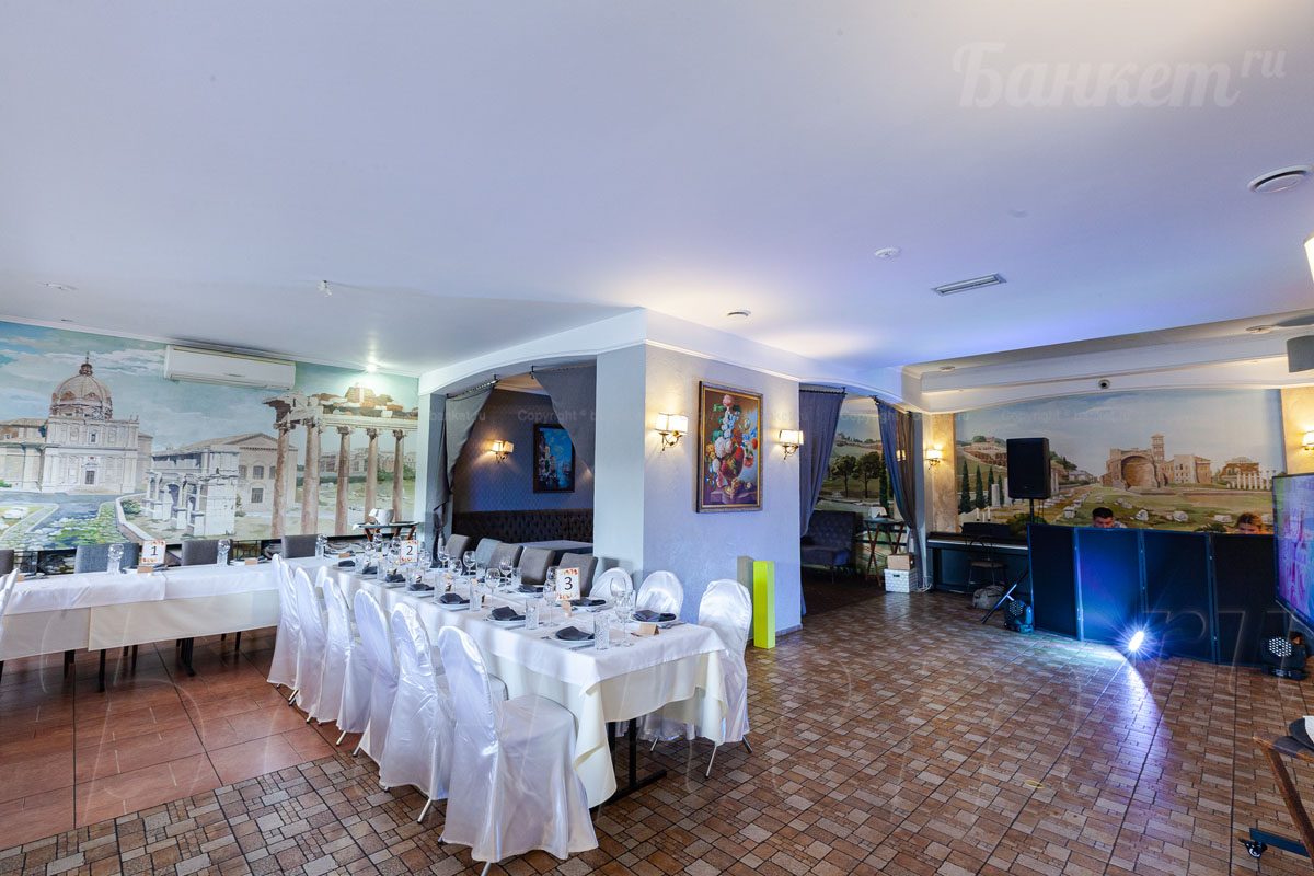 Банкетный зал ВИА Романо посадка до 60 человек. Фуршетная зона до 30 человек. Место для ведущего, танцпол, место под аппаратуру. , переносные стойки под тв, летняя веранда, парковка, детская комната, возможность организации детских праздников, живая музыка по пятницам, концерты.
