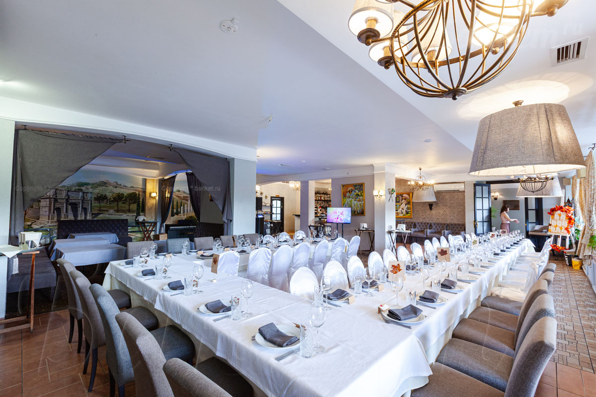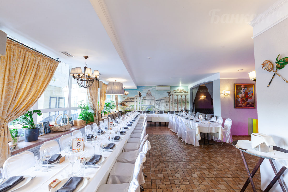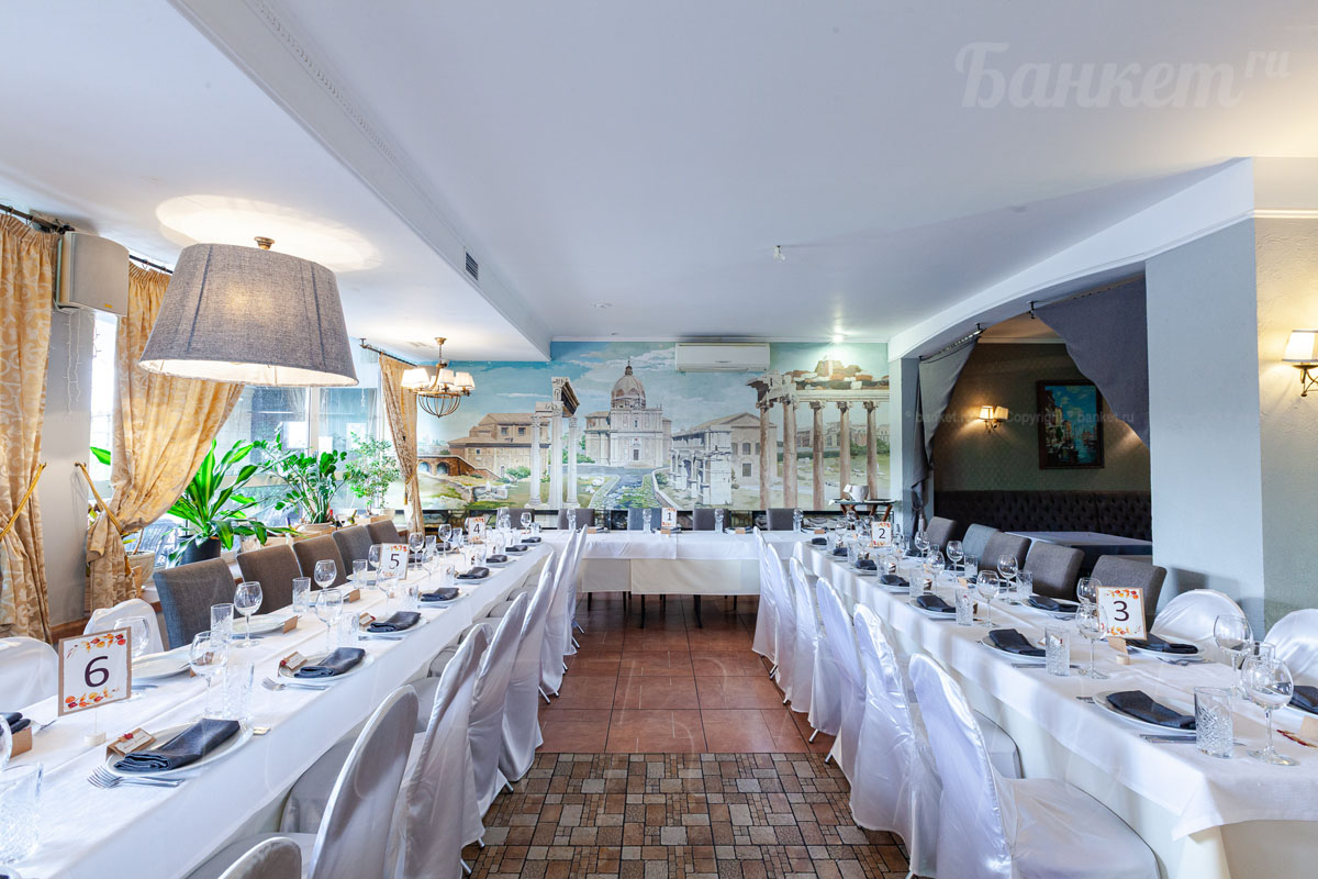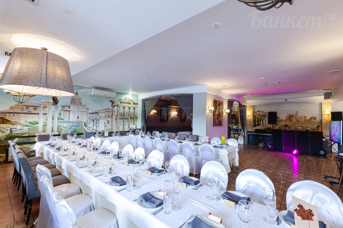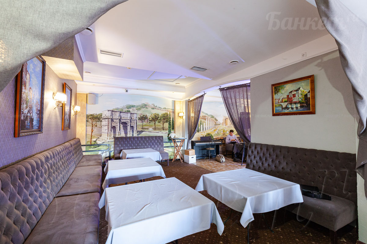 Банкетный зал ВИА Романо посадка до 60 человек. Фуршетная зона до 30 человек. Место для ведущего, танцпол, место под аппаратуру. , переносные стойки под тв, летняя веранда, парковка, детская комната, возможность организации детских праздников, живая музыка по пятницам, концерты.