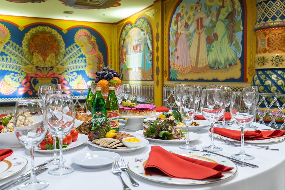 Интерьер площадки выдержан в этническом русском стиле с применением фольклорных декораций. Эффектная ручная роспись с былинными и историческими героями, высокие колонны с затейливыми узорами, массивные двери из дуба — все это создает удивительную атмосферу и делает зал привлекательным для посетителей.