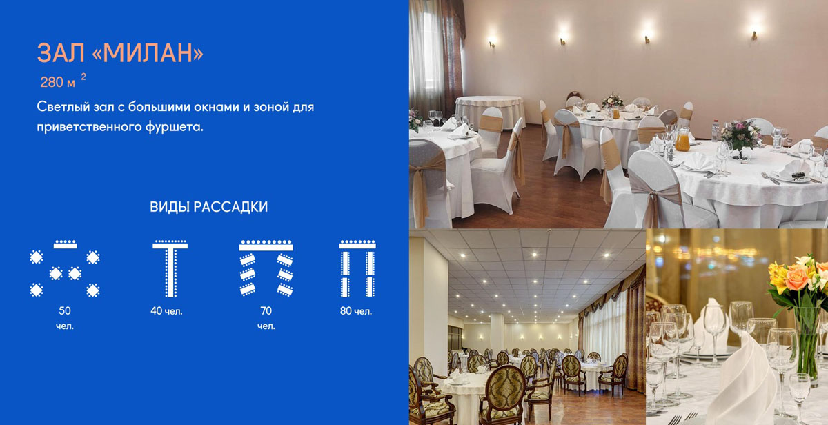 Залы рассчитаны для банкетов от 50 до 150 персон.