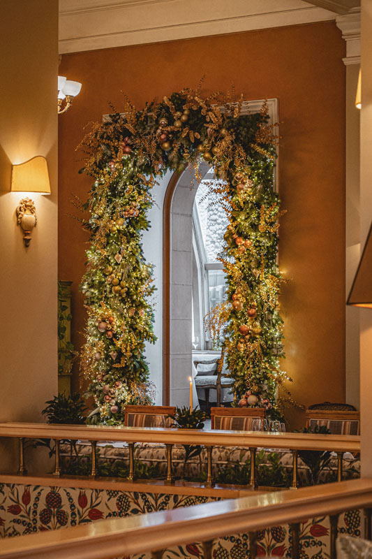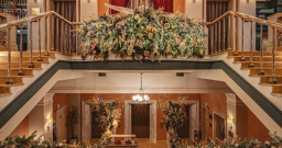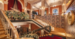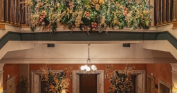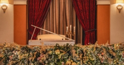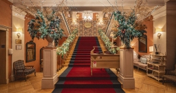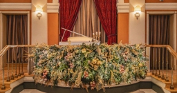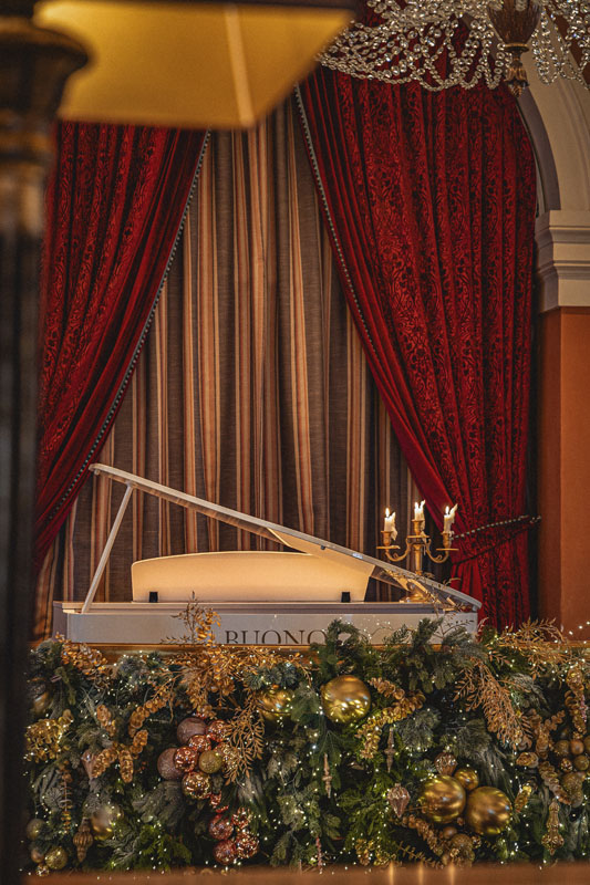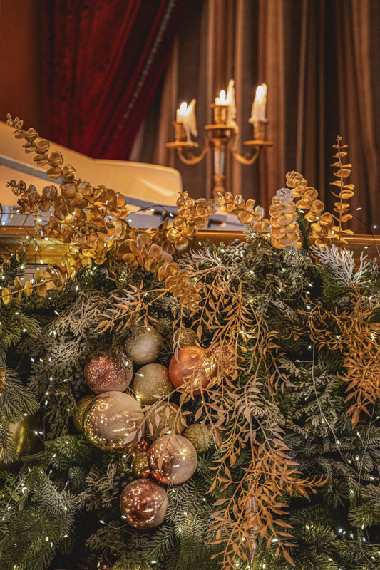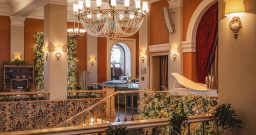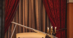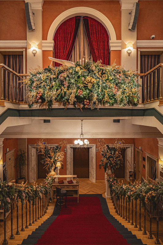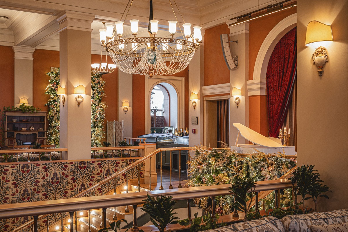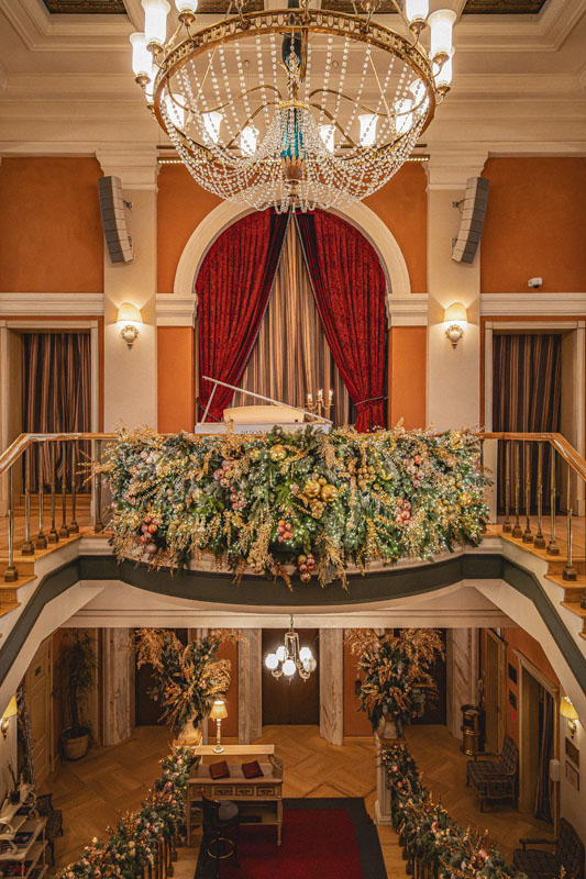 Поднимаясь по торжественной лестнице гости попадают в зал с высокими потолками и арочными окнами. Центром притяжения являются большая люстра, которая была отреставрирована во время реновации здания и сохранена как исторический артефакт бывшей гостиницы «Украина», и сцена в виде балкона оформленного периллами с золотыми балясинами, богатой портьерой и белым роялем.